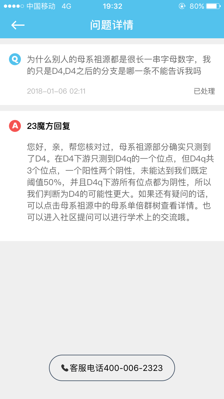 JA James 2018-01-29说明你无法被归类到任何已知的支系下。这个可能是由于23魔方的数据库没有覆盖到,也可能是你属于一个新的支系。等待23魔方的数据库丰富了以后,他们会更新的4 评论点赞 举报该评论 举报该评论 举报类型 违法违规 色情低俗 时政不实信息 引导站外加群 冒充他人 谩骂攻击 网络暴力 其他 无数据 举报描述 举报截图 提交 法图麦 2018-01-29魔方也是这样回复我的,但是不会更新了,除非我重新测点赞 举报该评论 举报该评论 举报类型 违法违规 色情低俗 时政不实信息 引导站外加群 冒充他人 谩骂攻击 网络暴力 其他 无数据 举报描述 举报截图 提交取消评论JA James 2018-01-29@法图麦:官方说的不会更新?你有没有授权他们保留样本?点赞 举报该评论 举报该评论 举报类型 违法违规 色情低俗 时政不实信息 引导站外加群 冒充他人 谩骂攻击 网络暴力 其他 无数据 举报描述 举报截图 提交取消评论取消评论