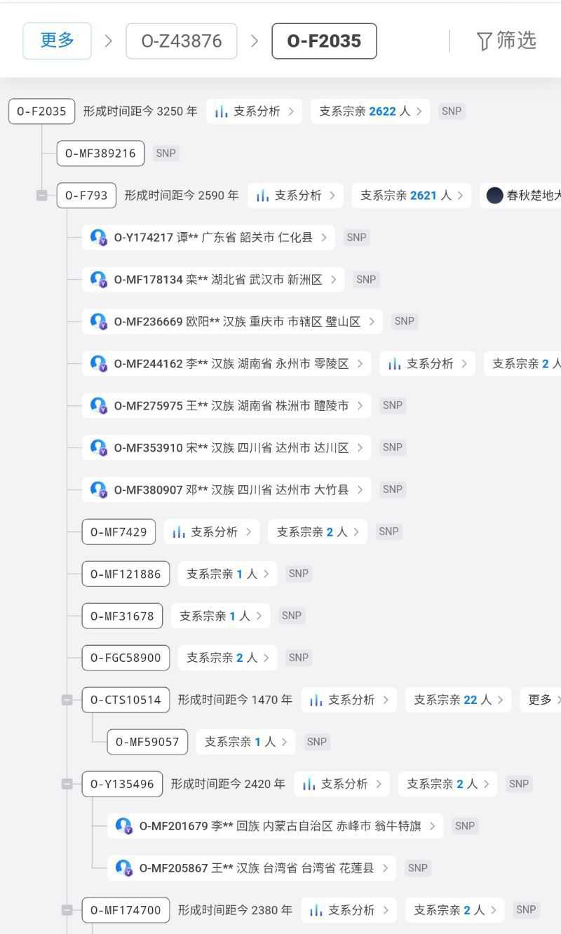 由于父系单倍群O-F793(O2a1b1a1a1a1a1a1b1)在长江中游检测到了距今3250年的新的上游O-F2035,所以现在基本可以认定先秦楚王室和楚公族就是O-F793(含O-F2035)这一父系单倍群。