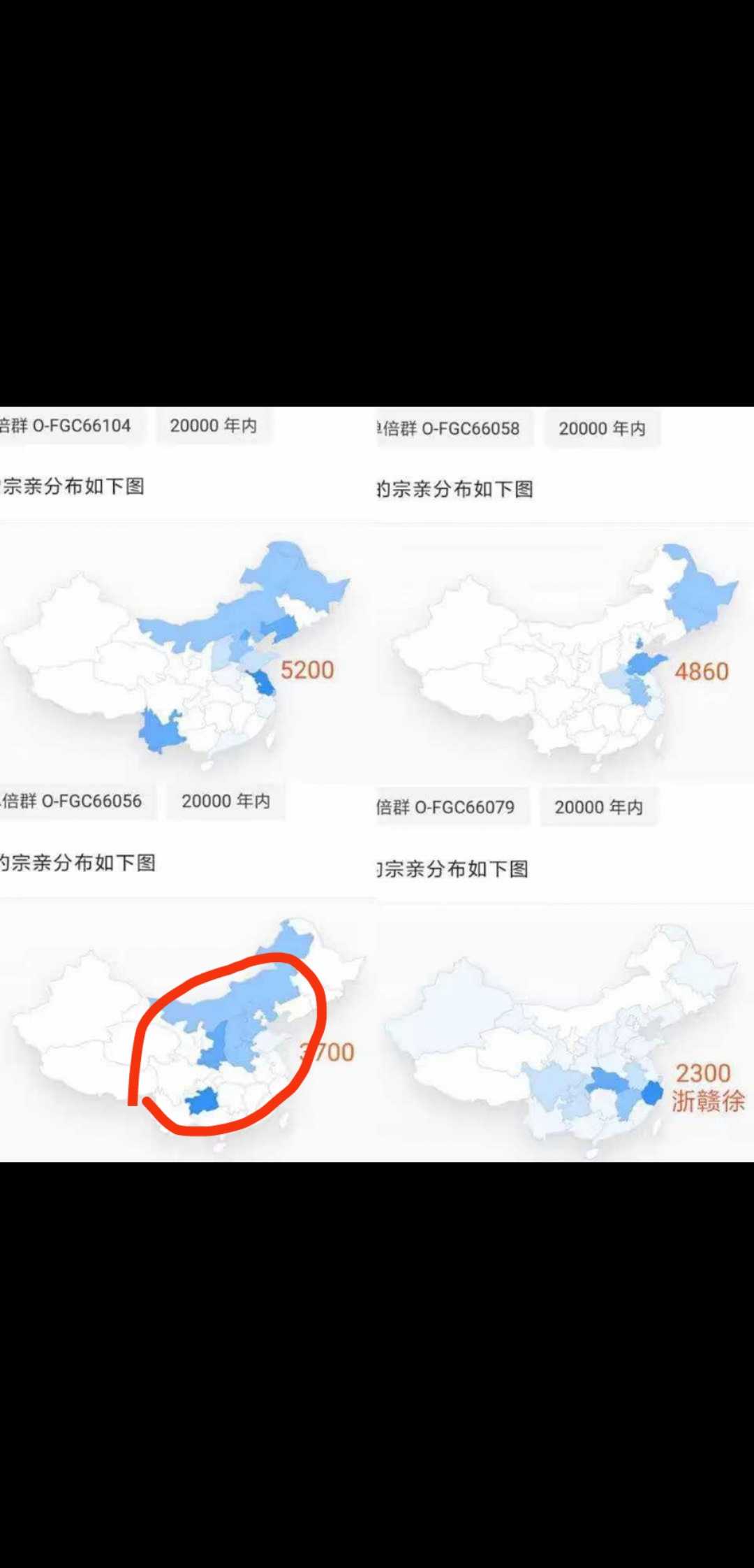 主要是66079分了三支,有两支分为南支和北支,北支集中在西北,辽宁,浙江和贵州,南支即66100,这一支又分为4619和66089,我认为可以对应南支祖徐霸和北支祖徐丰,但有个问题就是时间对应不上,也可能是误差问题没办法避免,误差个几百年是没问题的,如果是这样的话,那就很好的对应了徐霸(4619)和徐丰(66089),而上游66100对应徐该(徐福侄子),或徐光(下邳太守)。