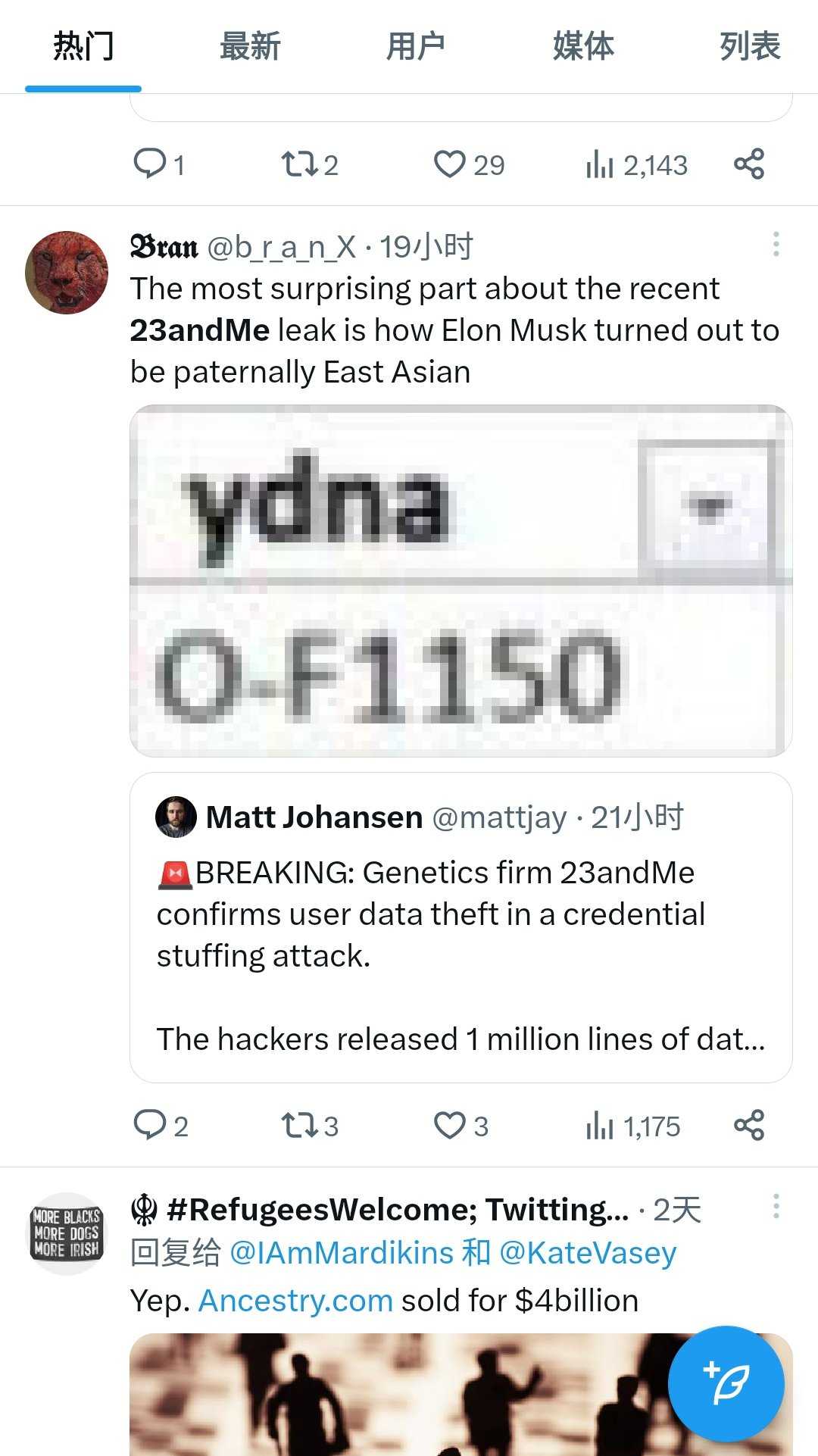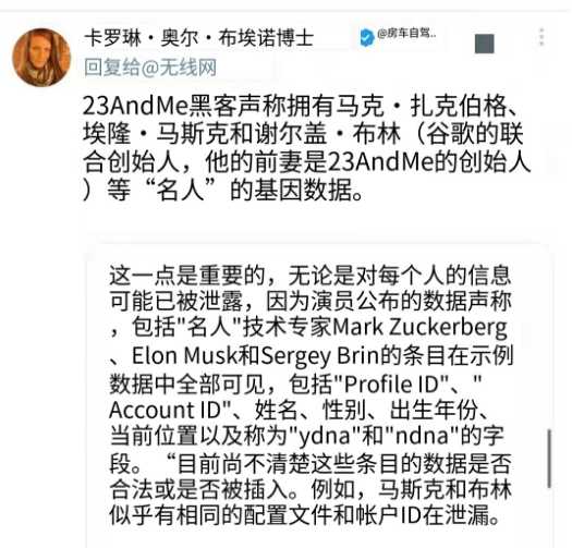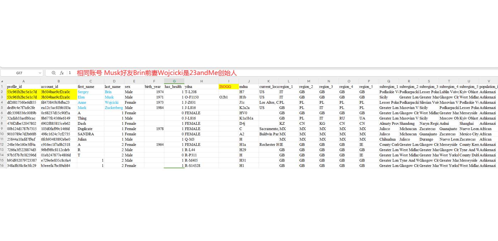 23andme的创始人是谢尔盖布林的前妻,马斯克与布林是多年好友。马斯克与布林是同一个账号下的两个样本,可能当初马斯克的样本无所谓的绑定了布林的账号。不管马斯克是不是犹太人,布林是个犹太人,或许因此抓取布林数据的时候把马斯克的也顺带抓取了。