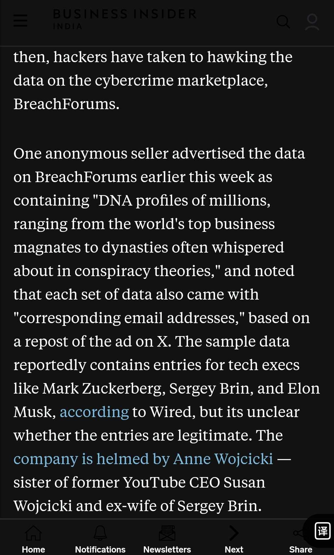本周早些时候,一个匿名卖家在BreachForums上发布了一个清单,声称可以获得各种个人的DNA图谱,包括“世界知名的商业大亨和神秘的王朝。” 卖方还提到,数据包括相应的电子邮件地址。这条信息是重新发布的据《连线》杂志报道,提供的样本数据应该包括马克·扎克伯格、谢尔盖·布林和埃隆·马斯克等知名科技公司高管的条目。然而,目前还不能确定这些条目是否是真实的。负责这些数据的公司是由安妮·沃西基领导的,她是YouTube前CEO苏珊·沃西基的妹妹,谢尔盖·布林的前妻。