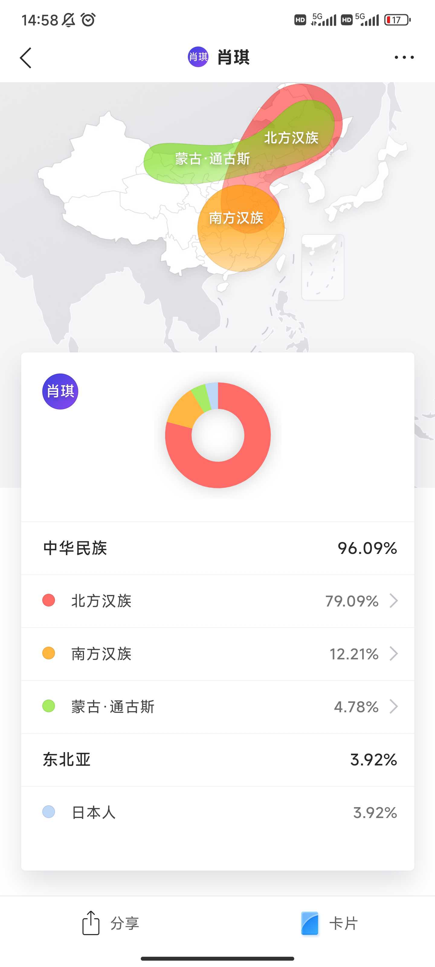 一看就是辽宁人,在当地很久了,因为我的常染和你差不多,与吉黑的高度纯汉不同,旧辽人都能测出不少南汉但没有南少血统伴随,另外东北亚成分高于吉黑汉,你现在是什么族
