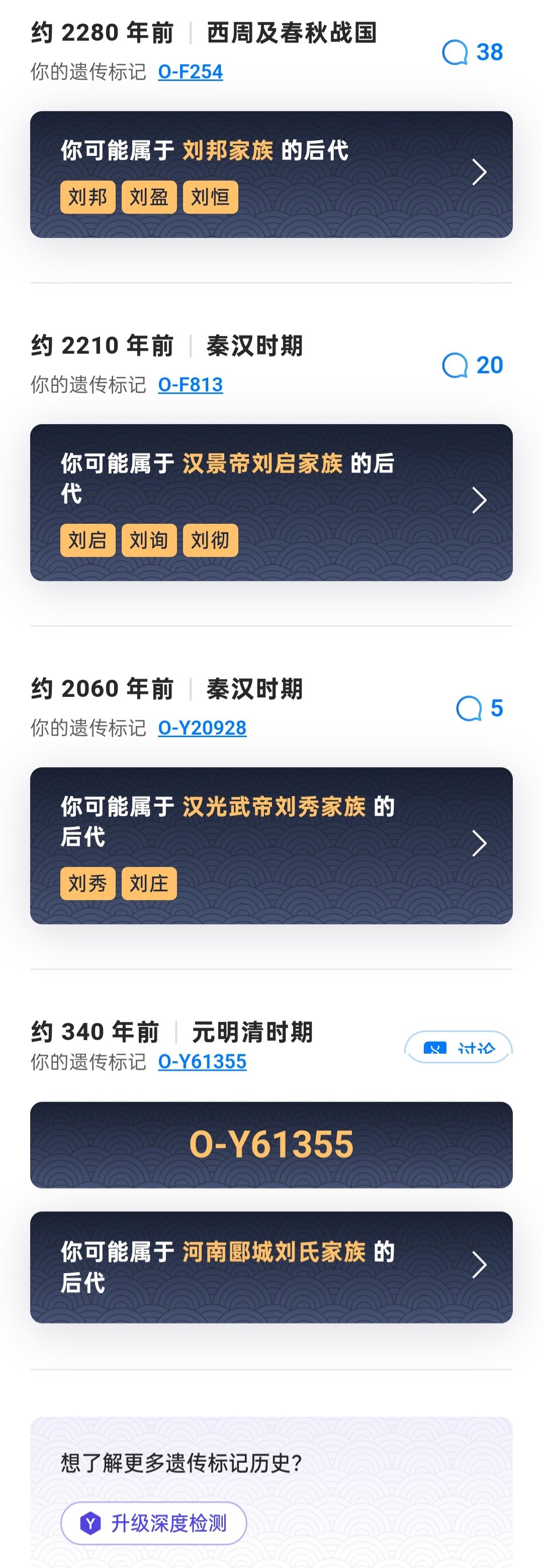 周述 周述 11-03可能是改姓或者收养过继这类的3 评论点赞 举报该评论 举报该评论 举报类型 违法违规 色情低俗 时政不实信息 引导站外加群 冒充他人 谩骂攻击 网络暴力 其他 无数据 举报描述 举报截图 提交玉米 玉米 11-03祖上感觉有可能,但是三百年内感觉概率很低,这个时间会不会不太准点赞 举报该评论 举报该评论 举报类型 违法违规 色情低俗 时政不实信息 引导站外加群 冒充他人 谩骂攻击 网络暴力 其他 无数据 举报描述 举报截图 提交取消评论周述 周述 11-03@玉米:有可能,因为这个时间理论上只是下面三个高通的共祖时间,你可能会是再上游一点的位置点赞 举报该评论 举报该评论 举报类型 违法违规 色情低俗 时政不实信息 引导站外加群 冒充他人 谩骂攻击 网络暴力 其他 无数据 举报描述 举报截图 提交取消评论取消评论