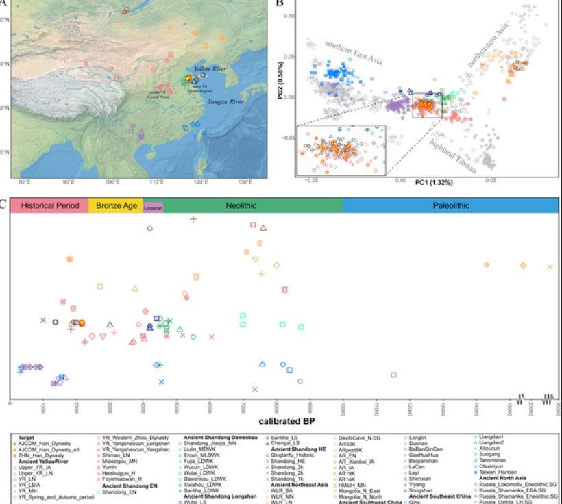 - 中原龙山文化相关祖源成分:绝对核心。山东汉代古人(徐家村东遗址)约 93.8% 源自该成分,是汉族遗传结构的主体 。该成分可追溯至新石器时代晚期的中原龙山人群,并在汉代时期已在黄河下游占据主导地位 。